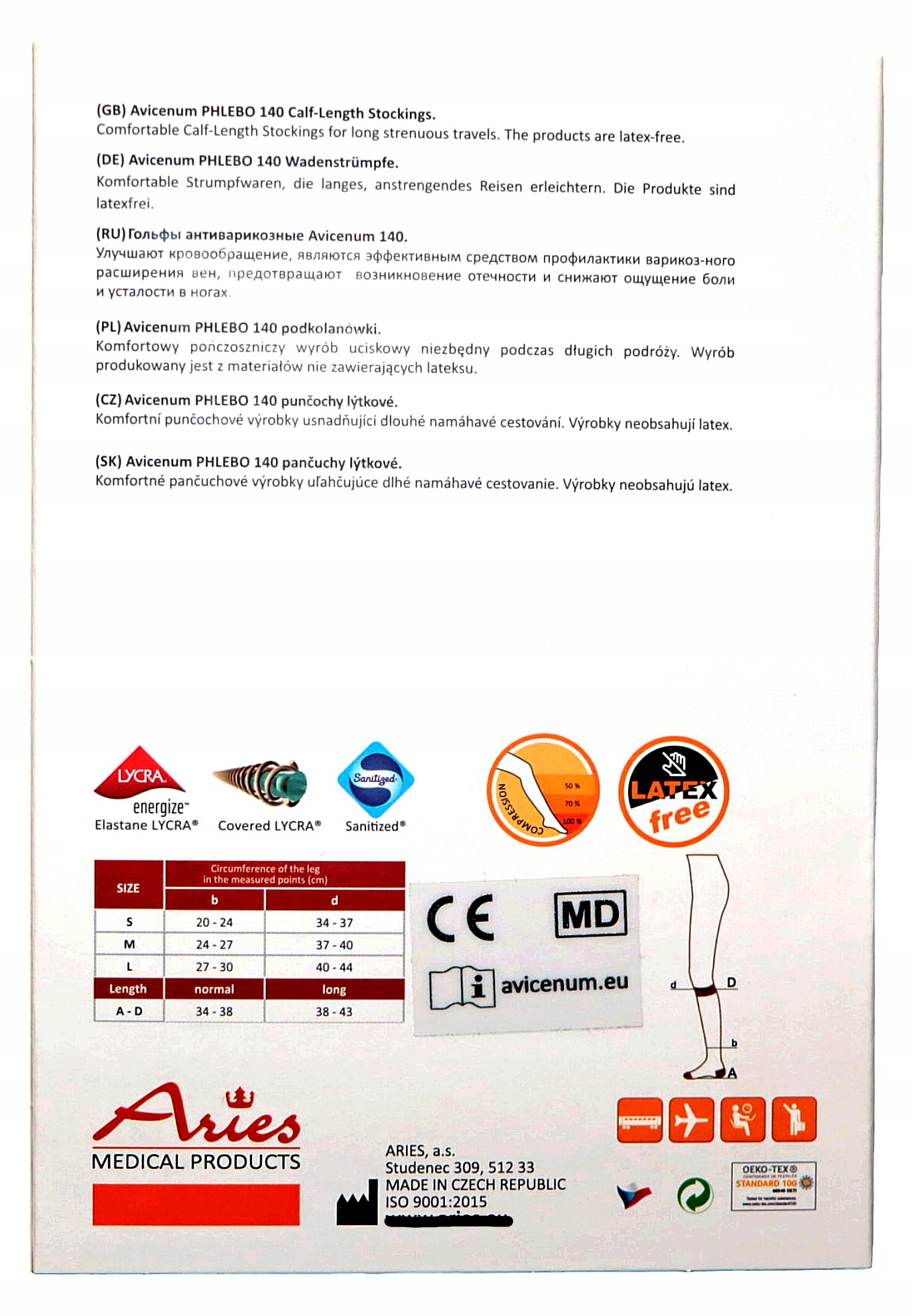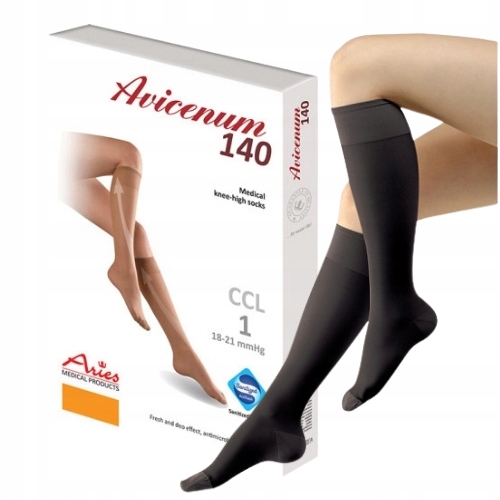 Avicenum PHLEBO 140 podkolanówki to kompresyjne medyczne wyroby pończosznicze I klasy kompresji.Zostały wykonane za pomocą technologii okrężnego splotu. Materiały użyte do wykonania kompresyjnych wyrobów medycznych są niedrażniące i nie zawierają lateksu. Mechanizm działania kompresyjnych wyrobów medycznych polega na działaniu precyzyjnie określonego stopniowanego ucisku na kończynę dolną, który stopniowo zmniejsza się od kostki w kierunku serca.