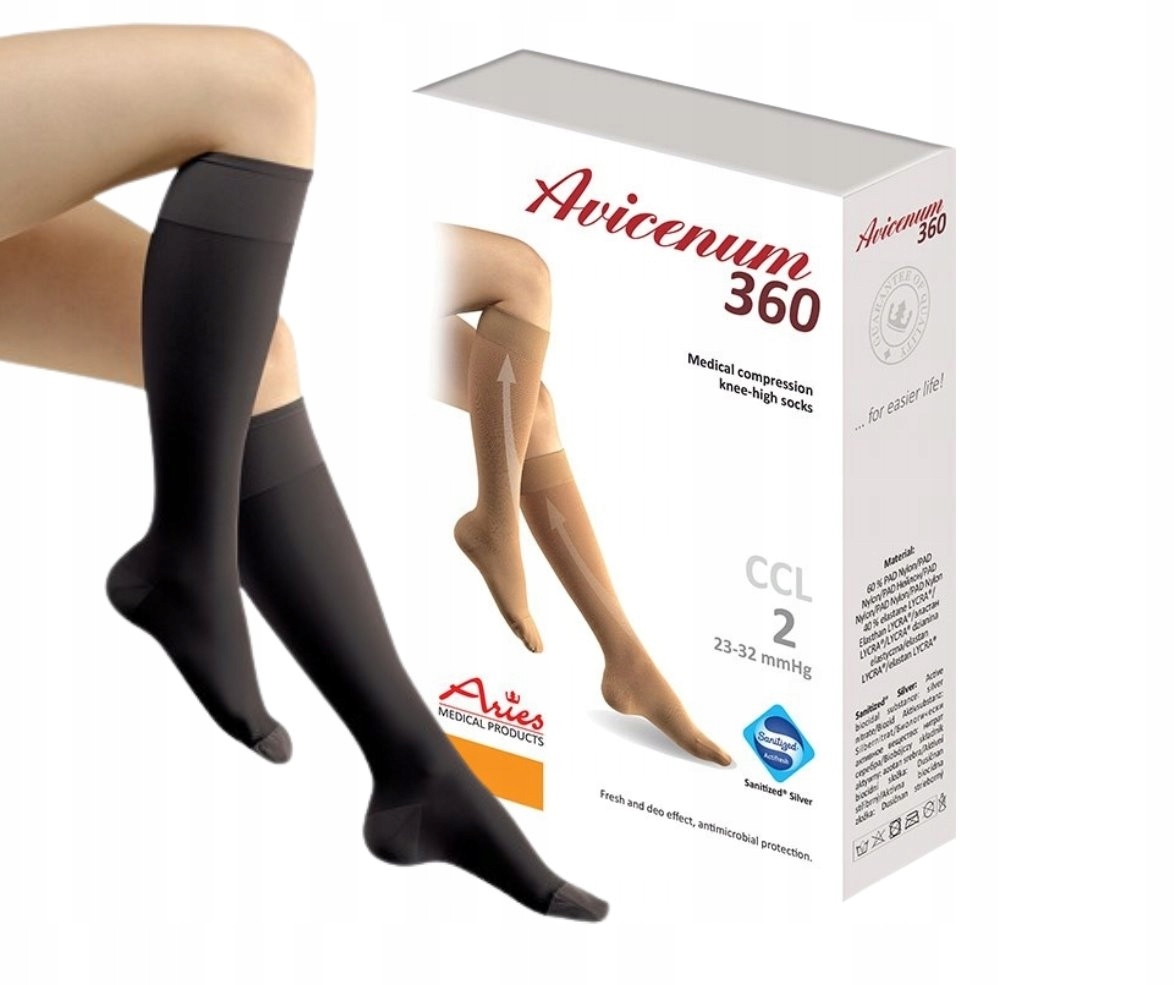 Avicenum PHLEBO 360 podkolanówki to pończoszniczy medyczny wyrób uciskowy w II klasie kompresji (CCL 2). Jest to wyrób okrągłodziany, produkowany z materiałów niedrażniących i niezawierających lateksu. Mechanizm działania pończoszniczego medycznego wyrobu kompresyjnego opiera się na wywieraniu określonego ucisku w okolicy kostki kończyny dolnej, który stopniowo maleje kierując się ku sercu. Ucisk w okolicy kostki jest największy i osiąga wartości 23-32 mmHg.