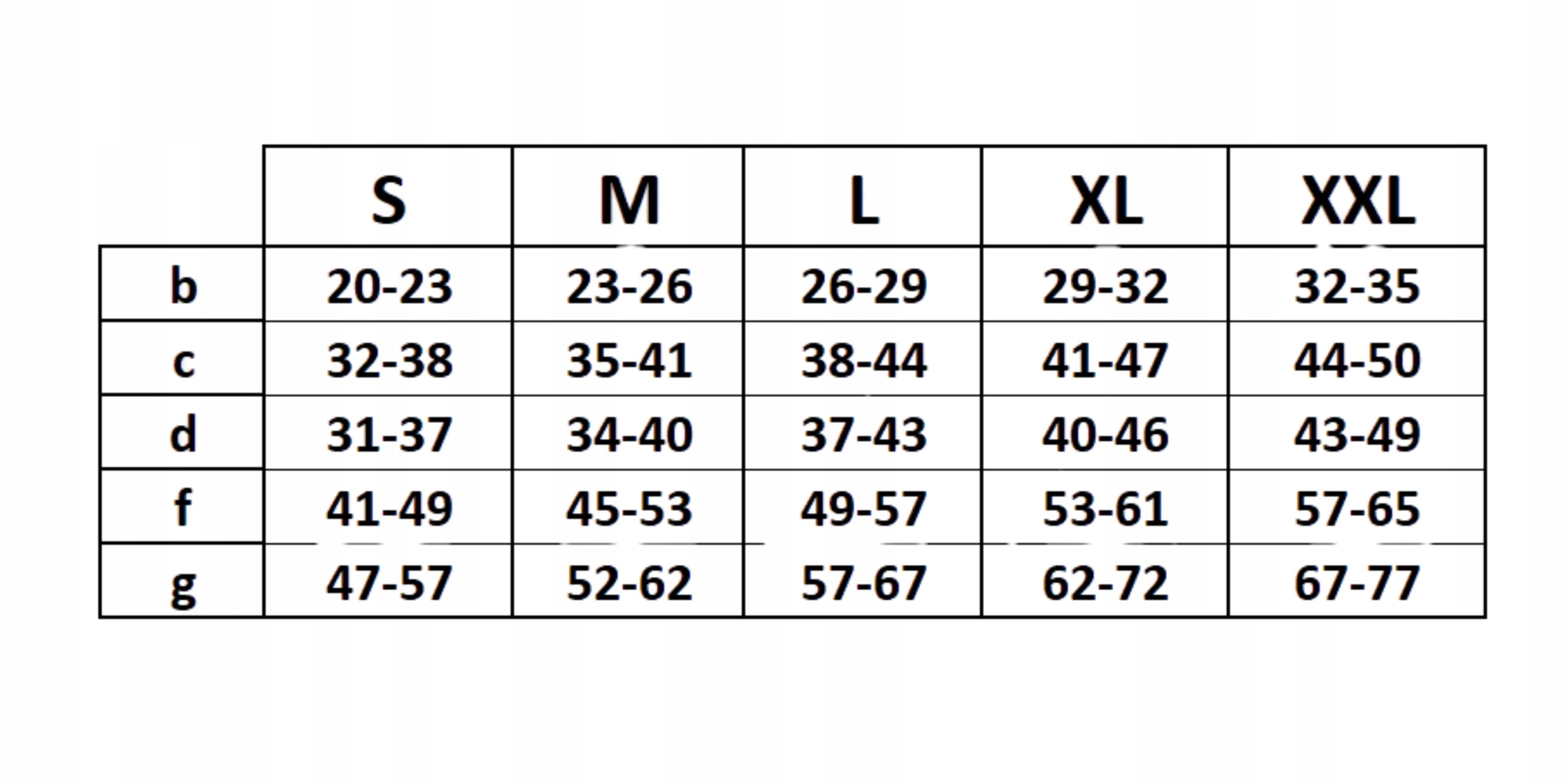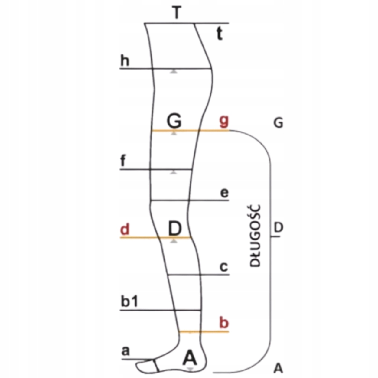 Przy doborze rozmiaru podkolanówek uciskowych bardzo ważne jest, aby zwrócić uwagę na prawidłowy pomiar. Poprawny rozmiar wpływa na prawidłowe działanie podkolanówek. Pomiar należy wykonać najlepiej rano, gdyż w ciągu dnia kończyny puchną, a wzięte miary nie byłyby poprawne. Zmierz obwody we wszystkich punktach według tabeli rozmiarów danego produktu (rozmieszczenie ich na kończynie ilustrują zdjęcia). Przy doborze rozmiaru kluczowe wartości znajdują się w punkcie b (obwód powyżej kostki), d (obwód poniżej kolana).