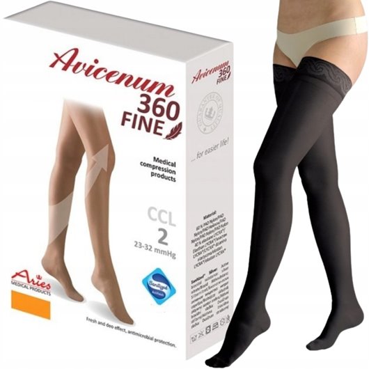 Avicenum PHLEBO 360 FINE pończochy to pończoszniczy medyczny wyrób uciskowy w II klasie kompresji (CCL2). Jest to wyrób okrągłodziany z delikatną, lekką, ale wytrzymałą strukturą. Wyrób produkowany jest z materiałów niedrażniących i niezawierających lateksu. Mechanizm działania pończoszniczego medycznego wyrobu kompresyjnego opiera się na wywieraniu określonego ucisku w okolicy kostki kończyny dolnej, który stopniowo maleje kierując się ku sercu. Ucisk w okolicy kostki, w miejscu pomiaru obwodu w punkcie b (patrz tabela rozmiarów) jest największy i osiąga wartości 23-32 mmHg. Aby osiągnąć pożądany efekt, konieczne jest, aby wybrać odpowiedni rozmiar. Wyrób uciskowy powinien być stosowany podczas aktywności fizycznej, natomiast podczas dłuższego przebywania w stanie spoczynku powinien być zdejmowany (chyba, że lekarz zaleci inaczej). Avicenum PHLEBO 360 FINE pończochy są wyrobem medycznym przeznaczonym do stosowania zarówno w warunkach domowych jak i placówkach opieki zdrowotnej. Jest to wyrób medyczny przeznaczony do kompresjoterapii stosowanej w chorobach naczyń żylnych i różnego pochodzenia obrzęków kończyn dolnych.