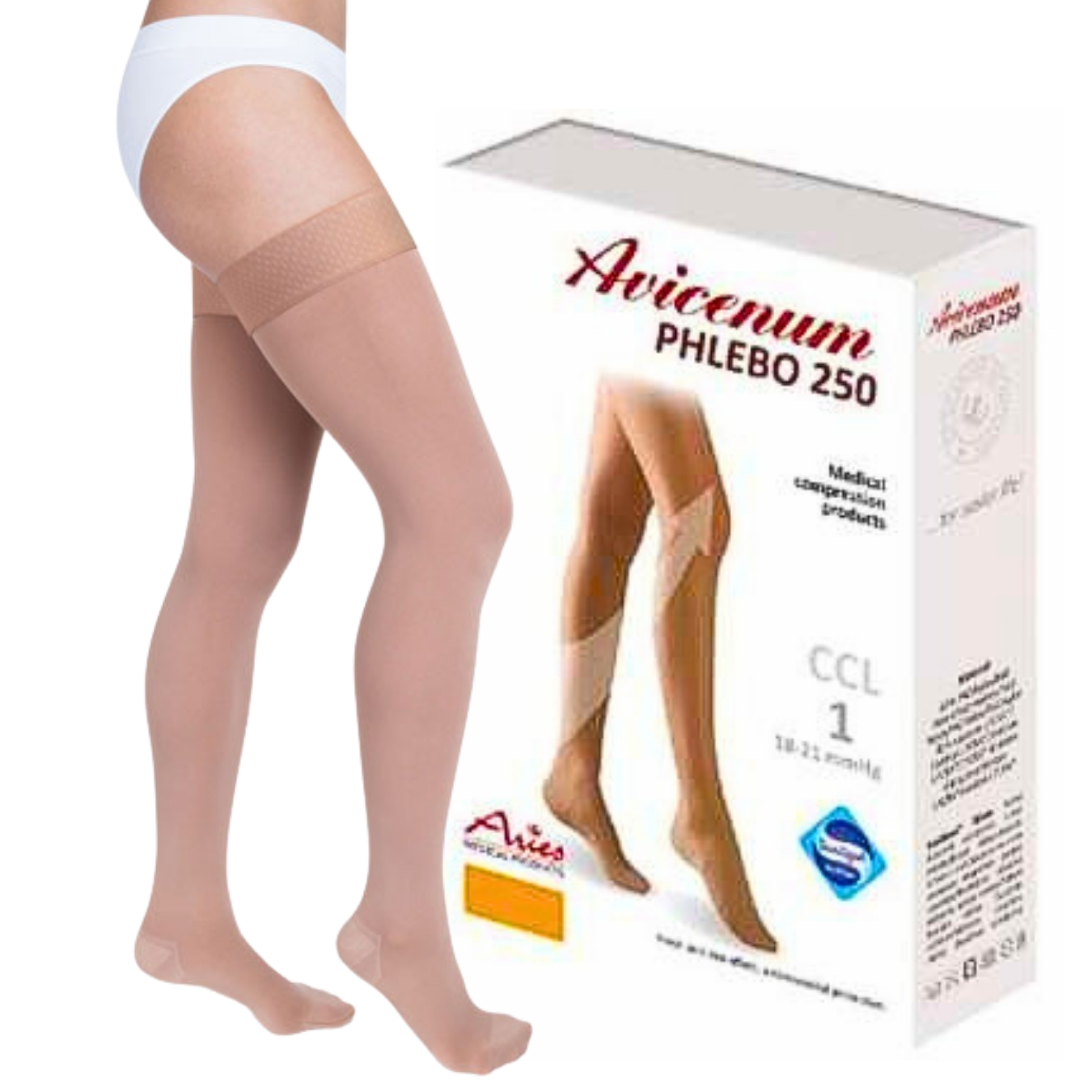 Avicenum PHLEBO 250 to kompresyjne medyczne wyroby pończosznicze I klasy kompresji (I KT, CCL 1). Zostały wykonane za pomocą technologii okrężnego splotu. Materiały użyte do wykonania kompresyjnych wyrobów medycznych są niedrażniące i nie zawierają lateksu. Mechanizm działania kompresyjnych wyrobów medycznych polega na działaniu precyzyjnie określonego stopniowanego nacisku na kończynę dolną, który stopniowo zmniejsza się od kostki w kierunku serca. Ciśnienie w okolicy kostki w punkcie b (patrz tabela rozmiarów) jest najwyższe i osiąga wartości 18 – 21 mmHg. Aby osiągnąć pożądany efekt, konieczny jest wybór odpowiedniego rozmiaru. Kompresyjnych medycznych wyrobów pończoszniczych należy używać podczas obciążania przy aktywności fizycznej, w czasie dłuższych przerw na odpoczynek należy zdjąć produkty kompresyjne (chyba że lekarz prowadzący zaleci inaczej). Avicenum PHLEBO 250 jest wyrobem medycznym przeznaczonym do stosowania zarówno w warunkach domowych, jak i placówkach opieki zdrowotnej.