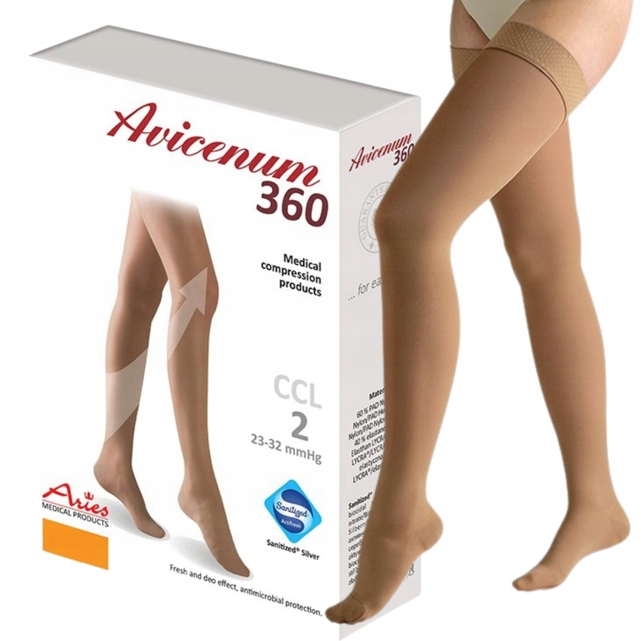 Avicenum PHLEBO 360 pończochy to pończoszniczy medyczny wyrób uciskowy w II klasie kompresji (CCL 2). Jest to wyrób okrągłodziany z delikatną,lekką ale wytrzymałą strukturą. Wyrób produkowany jest z materiałów niedrażniących i niezawierających lateksu. Mechanizm działania pończoszniczego medycznego wyrobu kompresyjnego opiera się na wywieraniu określonego ucisku w okolicy kostki kończyny dolnej, który stopniowo maleje kierując się ku sercu. Ucisk w okolicy kostki, w miejscu pomiaru obwodu w punkcie b (patrz tabela rozmiarów) jest największy i osiąga wartości 23-32 mmHg. Aby osiągnąć pożądany efekt, konieczne jest, aby wybrać odpowiedni rozmiar. Wyrób uciskowy powinien być stosowany podczas aktywności fizycznej, natomiast podczas dłuższego przebywania w stanie spoczynku powinien być zdejmowany (chyba, że lekarz zaleci inaczej). Avicenum PHLEBO 360 pończochy są wyrobem medycznym przeznaczonym do stosowania zarówno w warunkach domowych jak i placówkach opieki zdrowotnej. Avicenum PHLEBO 360 pończochy to wyrób medyczny przeznaczony do komresjoterapii stosowanej w chorobach naczyń żylnych i różnego pochodzenia obrzęków kończyn dolnych.