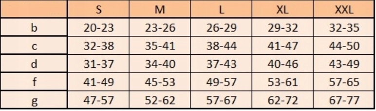 Przy doborze rozmiaru pończoch uciskowych bardzo ważne jest, aby zwrócić uwagę na prawidłowy pomiar. Poprawny rozmiar wpływa na prawidłowe działanie pończoch. Pomiar należy wykonać najlepiej rano, gdyż w ciągu dnia kończyny puchną, a wzięte miary nie byłyby poprawne. Zmierz obwody we wszystkich punktach według tabeli rozmiarów danego produktu (rozmieszczenie ich na kończynie ilustrują zdjęcia). Przy doborze rozmiaru kluczowe wartości znajdują się w punkcie b (obwód powyżej kostki), d (obwód poniżej kolana) i g (obwód uda 5 cm poniżej krocza). Równie ważny jest pomiar długości między punktami A – G,który określamy od podłogi powewnętrznej stronie nogi.
