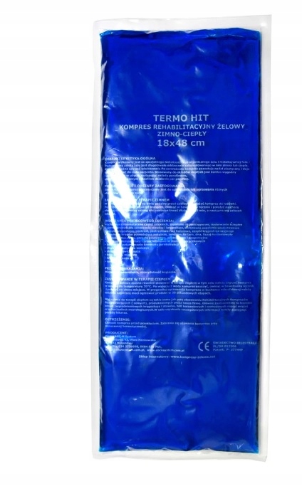 Duże podłużne kompresy żelowe o wymiarach 18x48cm sprawdza się szczególnie w bólach pleców i kończyn. Przykładanie zimnych lub ciepłych okładów pozwala skutecznie leczyć wiele schorzeń. Teraz przygotowanie kompresu może być bardzo proste dzięki jego żelowej postaci. Unikamy efektu ściekania czy kapania wody. Ponadto zarówno ciepła, jak i zimna temperatura okładu utrzymuje się dłużej. Lecznicze działanie kompresów zostało wielokrotnie potwierdzone w praktyce leczenia i funkcjonuje w medycynie od wielu lat. Najważniejszą funkcją kompresu jest długotrwałe oddawanie zakumulowanego zimna lub ciepła. Okładów z naszych kompresów można używać wielokrotnie, w żelu znajdującym się w okładzie nie zachodzą żadne zmiany chemiczne, dzięki czemu w żaden sposób nie traci swych właściwości.Zastosowanie kompres powodujące ogrzanie lub schłodzenie wybranych obszarów ciała, dzięki czemu uzyskujemy lepszy efekt rehabilitacji.