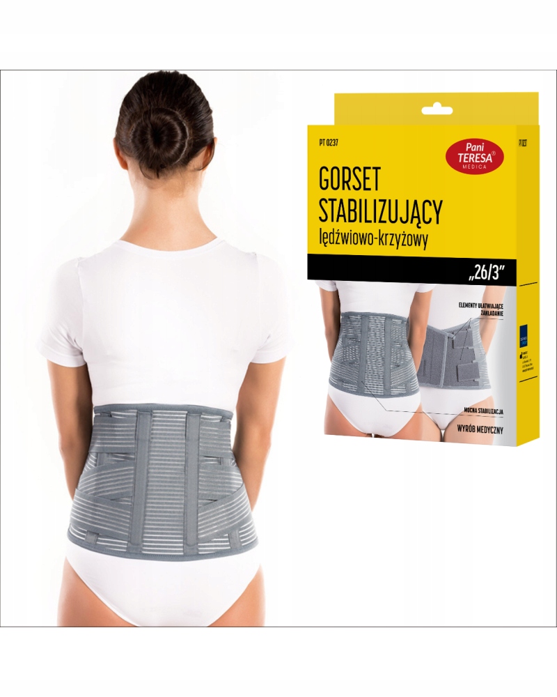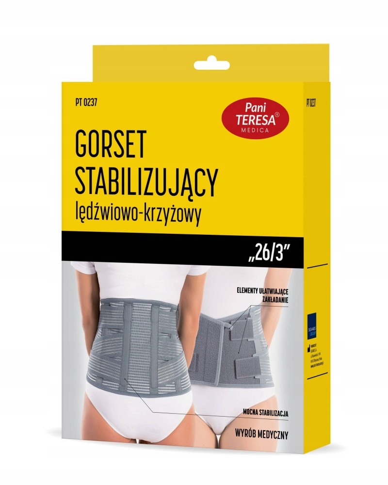Gorset stabilizujący lędźwiowo-krzyżowy „26/3” od Pani Teresa Medica to zaawansowany produkt medyczny, który wspomaga stabilizację i odciążenie odcinka lędźwiowo-krzyżowego kręgosłupa. Stworzony z myślą o osobach borykających się z bólem pleców, urazami czy stanami zapalnymi, ten gorset oferuje doskonałe podparcie, jednocześnie zapewniając komfort noszenia przez cały dzień. Wykonany z oddychających, elastycznych materiałów, idealnie dopasowuje się do sylwetki, co zapewnia wygodę w codziennym użytkowaniu. Dzięki solidnym szynom ortopedycznym oraz regulowanym zapięciom, gorset można łatwo dopasować do indywidualnych potrzeb pacjenta, co wspomaga leczenie i rehabilitację. Produkt ten jest rekomendowany przez specjalistów w leczeniu schorzeń kręgosłupa oraz profilaktyce urazów lędźwiowo-krzyżowych. Idealny zarówno do użytku domowego, jak i podczas aktywności fizycznej.