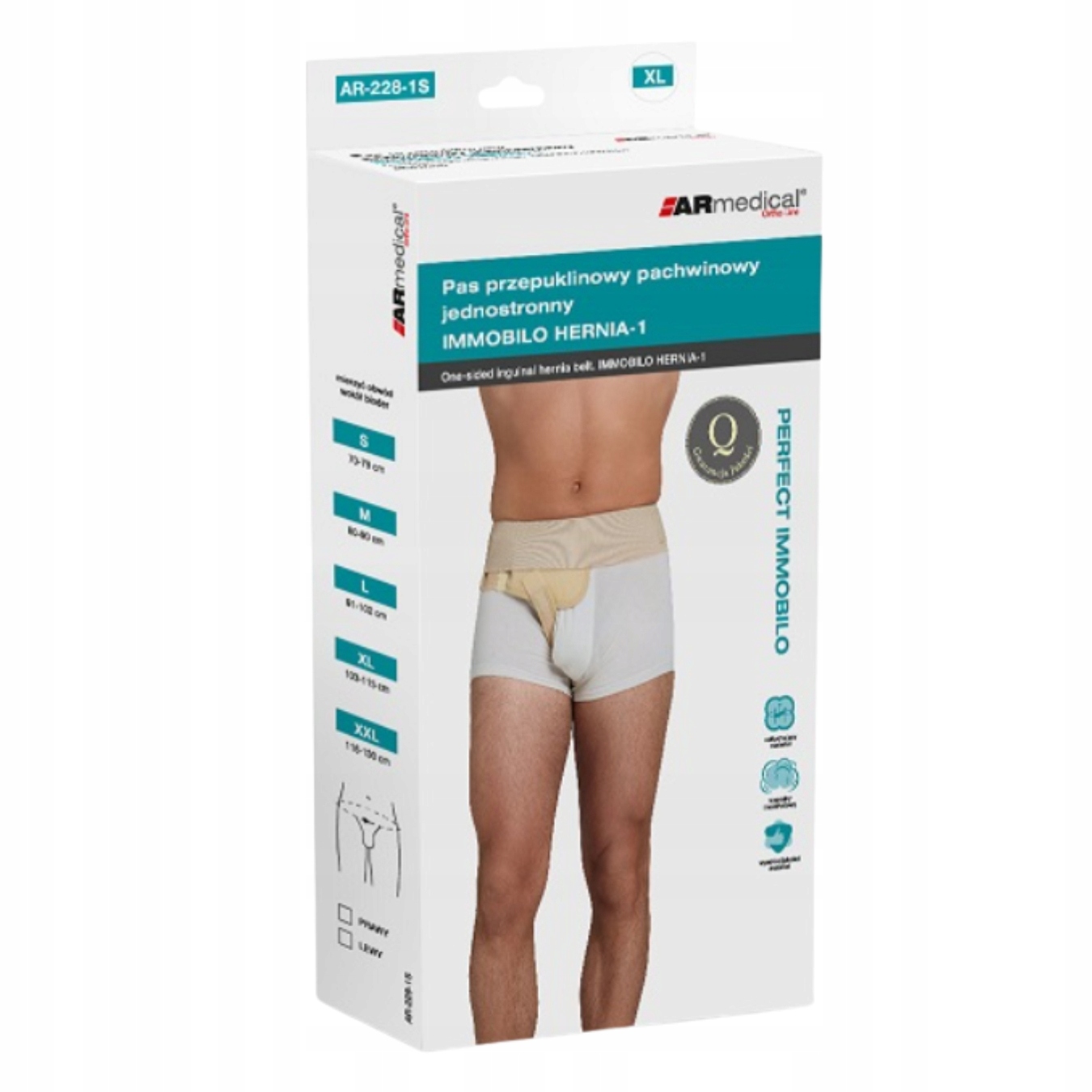Pas wykonany z innowacyjnych materiałów. Materiał pokrywający pelotę (od strony wewnętrznej), miękki, delikatny i oddychający. Umożliwiający odprowadzanie ciepła, ze wzmocnioną siłą odprowadzania wilgoci. Dopinana pachwinowa taśma z Velcro – wąską, z zaokrąglonymi krawędziami dla zwiększenia komfortu użytkowania. Pas główny niezwykle wytrzymały, o dużej kompresji, utrzymujący wyrób na właściwej pozycji. Pelota odpowiednio wyprofilowana, specjalny kształt zapewnia dopasowanie do anatomicznej budowy ciała i odpowiednie właściwości terapeutyczne. Wykorzystanie nowoczesnego systemu zapinania gwarantuje idealne przyleganie zapewniając przy tym komfort oraz solidną stabilizację.