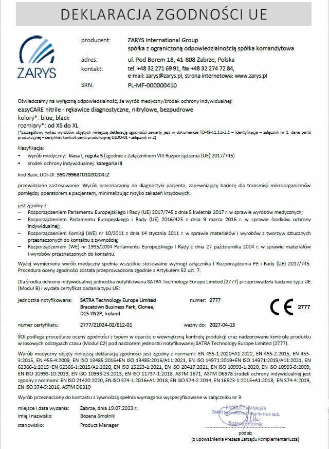 To jest wyrób medyczny. Używaj go zgodnie z instrukcją używania lub etykietą. W przypadku wątpliwości skonsultuj się ze specjalistą, gdyż ten wyrób medyczny może nie być odpowiedni dla Ciebie. Produkt został oznaczony znakiem CE oraz MD. Producent wystawił dla niego deklarację zgodności UE. Do wyrobu załączone są informacje konieczne do zidentyfikowania wyrobu i jego producenta, a także wszelkie informacje dotyczące bezpieczeństwa i działania istotne dla użytkownika. Produkt posiada etykietę w języku polskim.