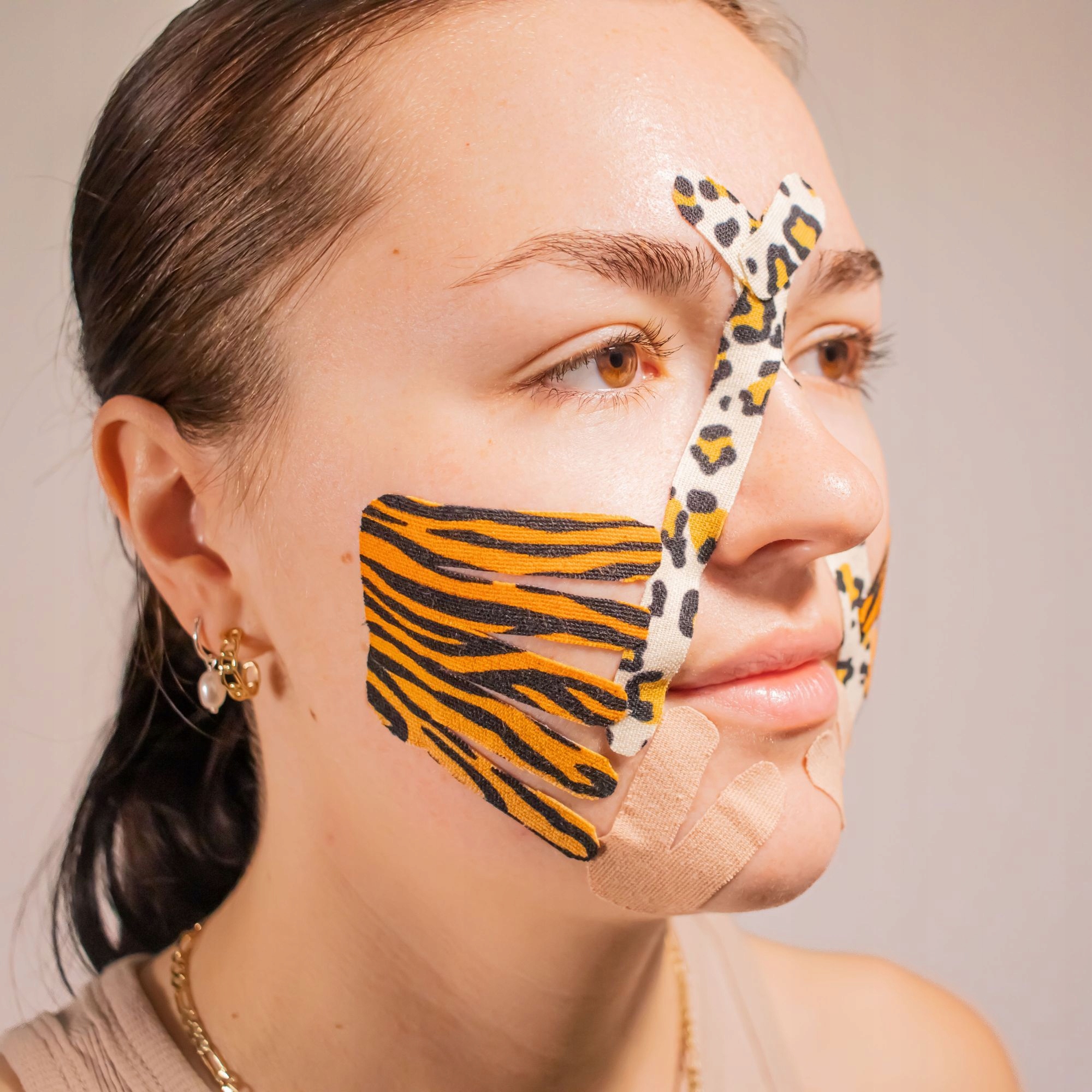 - Taśma kinezjologiczna świetnie sprawdza się jako wsparcie w codziennej pielęgnacji twarzy i ciała. Może być stosowana w tapingu limfatycznym i estetycznym w celu poprawy wyglądu skóry i jej ogólnego komfortu. Pomaga zmniejszyć widoczność napięć mimicznych, delikatnie wygładzić rysy oraz podkreślić owal twarzy. Jest również popularnym uzupełnieniem masaży i zabiegów liftingujących wykonywanych w domowej pielęgnacji.