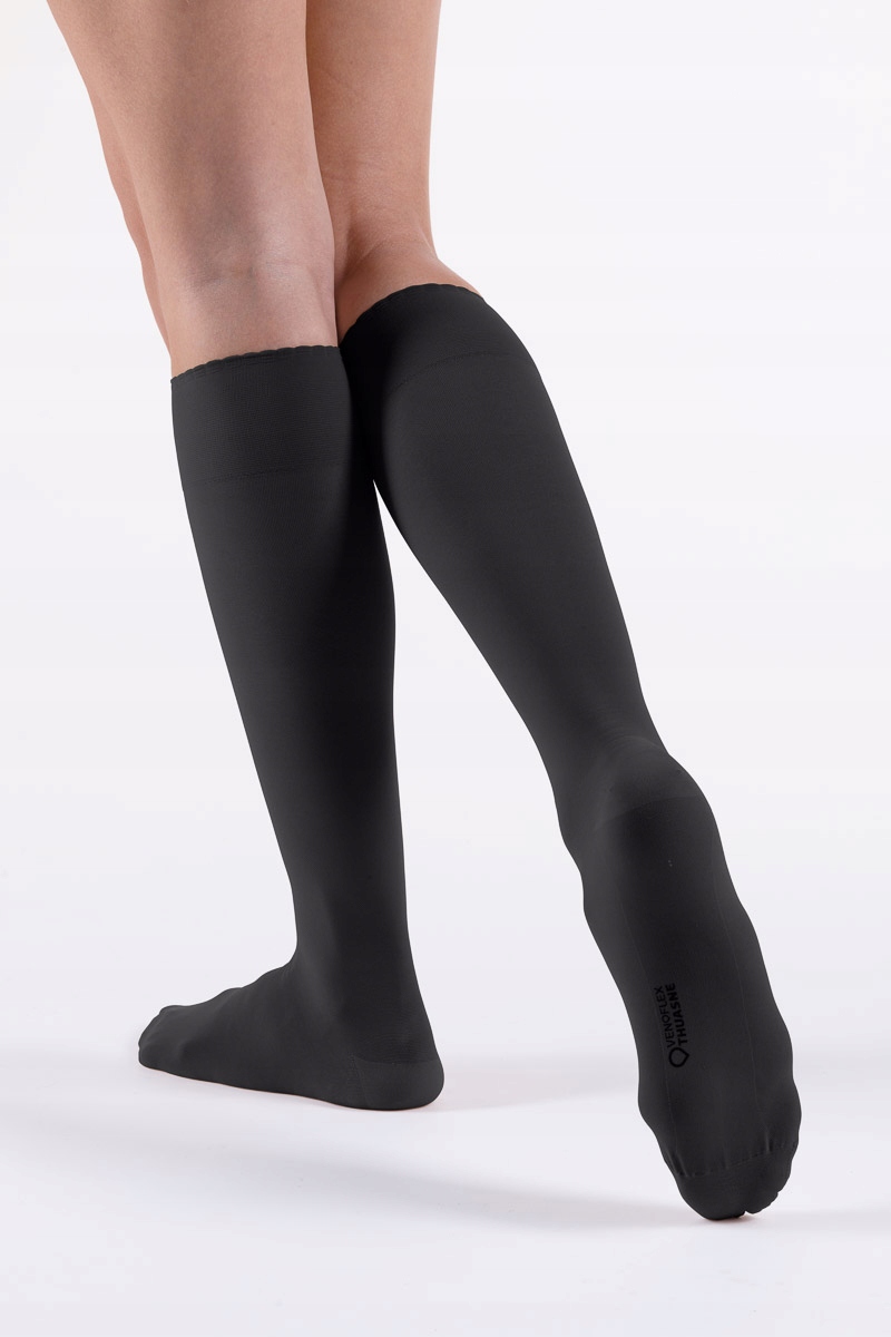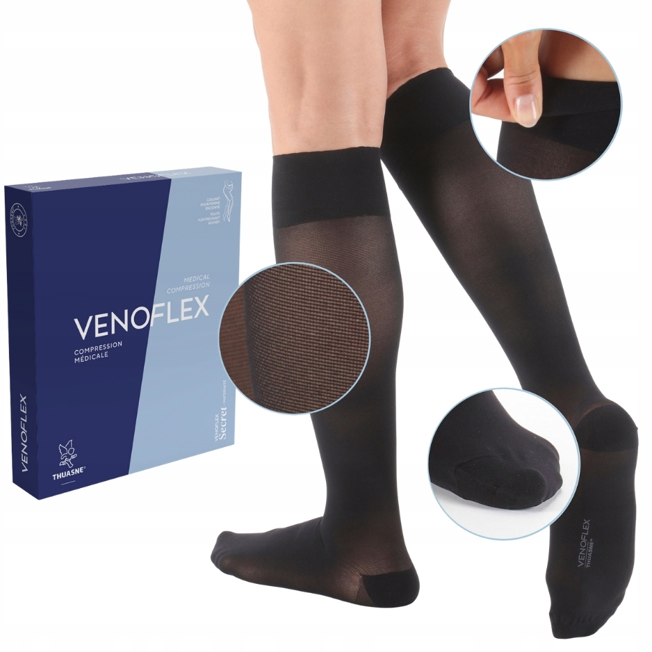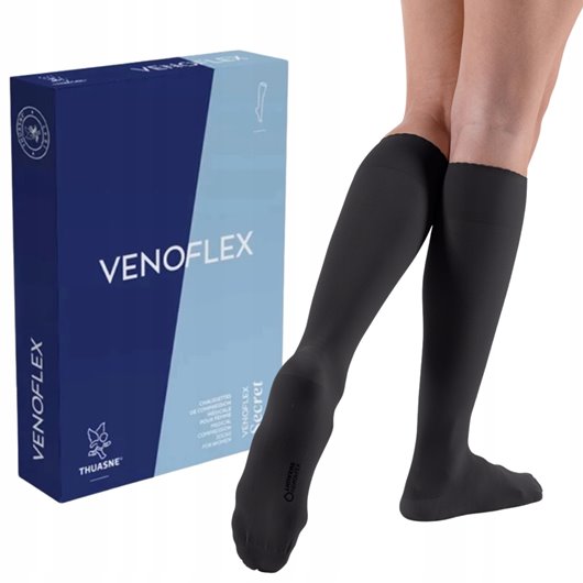 Kolekcja Venoflex Secret to wyroby kompresyjne dla kobiet w każdym wieku, które cenią sobie miękkość i łatwość zakładania. Podkolanówki, pończochy, rajstopy Venoflex Secret mogą być noszone wiosną oraz latem. Sprawdzą się w pracy oraz na co dzień. Podkolanówk Venoflex Secret to podkolanówki przeciwżylakowe, które wykonano w standardzie ASQUAL. Doskonale sprawdzają się przez cały rok, ponieważ zastosowano w nich przędze tworzącą półtransparentną, miękką siateczkę. Podkolanówki bardzo dobrze układają się na nogach. Płaskie szwy, które zastosowano w okolicy palców, zapewniają duży komfort stopom, a wzmocnione pięty chronią pończochy przed uszkodzeniami. Podkolanówki Secret występują w dwóch klasach kompresji. Pierwsza z nich, która oznaczona jest 15–20 mm Hg, charakteryzuje podkolanówki o przeznaczeniu głównie profilaktycznym. Podkolanówki o ucisku 20-36mmHg są środkiem wspomagającym leczenie, a więc przeznaczone są dla osób, u których choroba już wystąpiła. Ich zakup warto poprzedzić rozmową z lekarzem prowadzącym.