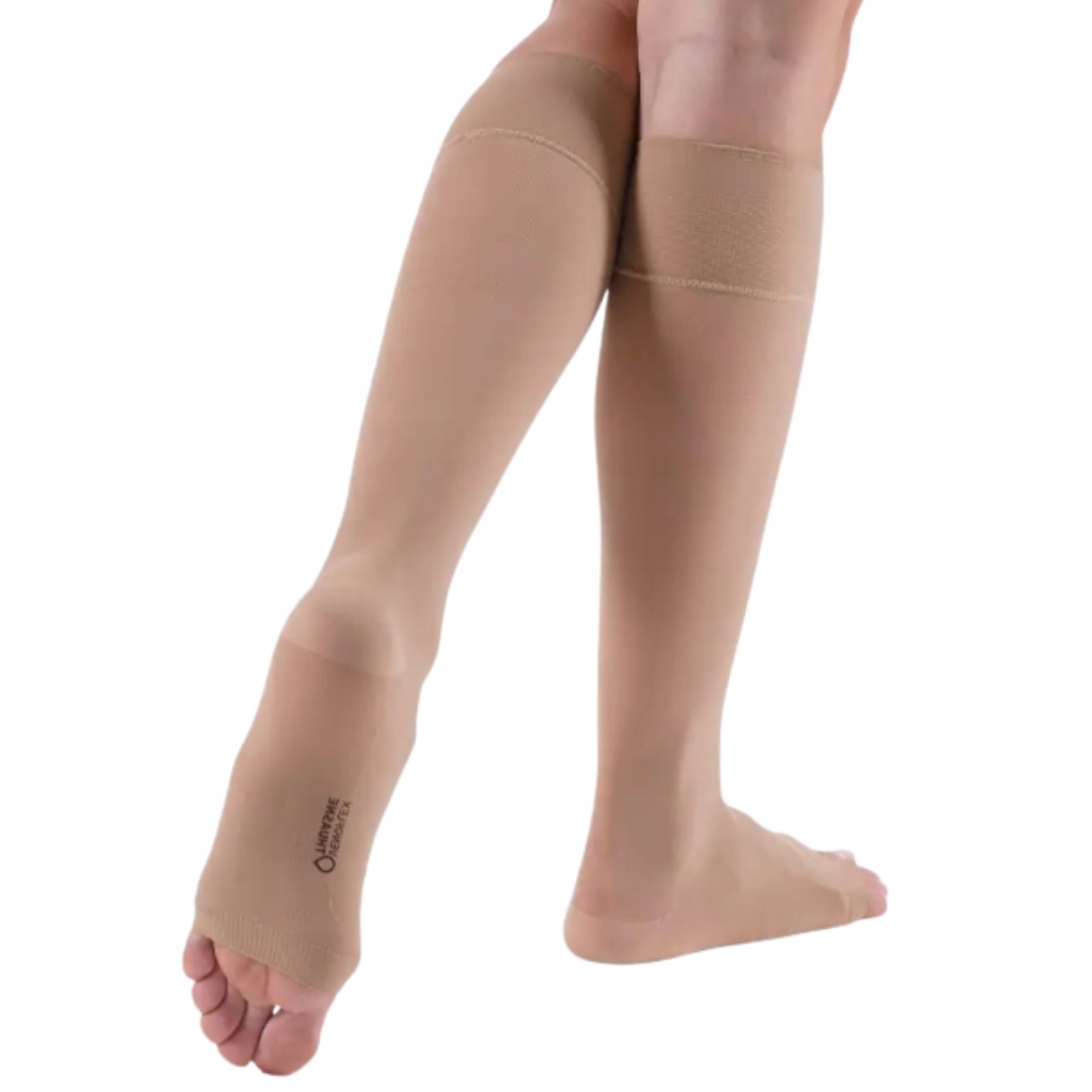 Produkt posiada 2 klasę ucisku według normy RAL, co odpowiada 3 klasie ucisku według francuskiej normy ASQUAL. W praktyce oznacza to, że podkolanówki zapewniają ucisk w zakresie 20–36 mmHg. Dlaczego podawane są dwa oznaczenia (ASQUAL i RAL)? Różne kraje stosują różne systemy klasyfikacji wyrobów uciskowych, dlatego 3 klasa ASQUAL = 2 klasa RAL. Podajemy oba standardy, aby ułatwić dopasowanie odpowiedniego poziomu ucisku. Podkolanówki z palcami odkrytymi posiadają certyfikat ASQUAL. Wybierając palce odkryte można użyć ,, śliskiej stopki" w celu łatwiejszego ubrania wyrobu. Śliską stopkę zakłada się na gołą stopę a następnie ubiera podkolanówki. Na końcu wyciąga się ją przez odkryte palce. Śliska stopka dołączona jest do podkolanówek.