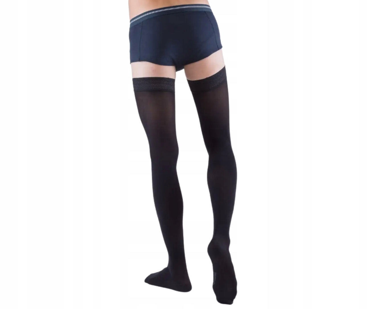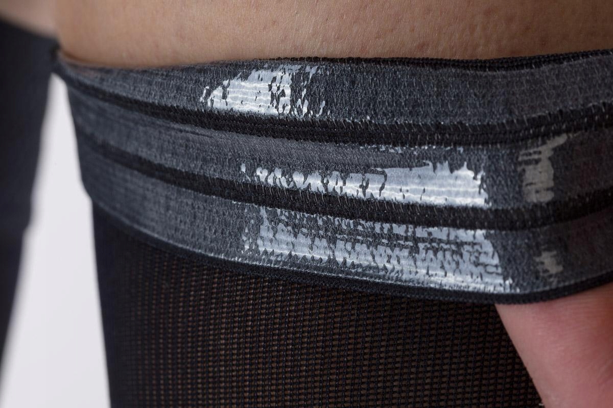 - Przy zakładaniu nie należy ciągnąć wyrobu do góry, lecz delikatnymi ruchami, najlepiej używając gumowych rękawic, płasko ułożonymi dłońmi równomiernie rozciągać materiał na nodze.