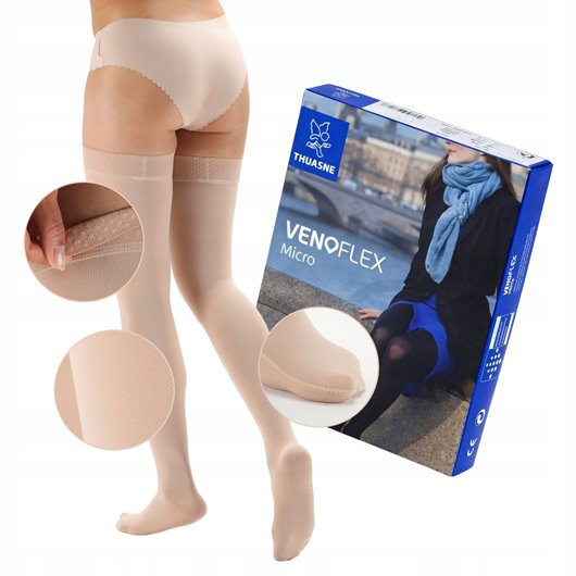 Venoflex Pończochy Damskie – Micro to pończochy przeciwżylakowe, które wykonano w standardzie RAL. Jako materiał zastosowano w nich mikrofibrę, która ma właściwości hipoalergiczne. Pończochy wykonano z materiału, który nie traci swoich właściwości kompresyjnych, pomimo stosowania maści leczniczych w trakcie noszenia. Pończochy Micro dostępne są w wariantach z otwartymi i zamkniętymi palcami oraz w dwóch długościach. Producent oferuje także dwa kolory Pończochy: czarny i karmelowy. Dostępne są aż w sześciu rozmiarach i w dwóch wariantach: z otwartymi i zamkniętymi palcami. Można z powodzeniem używać ich przez cały rok.