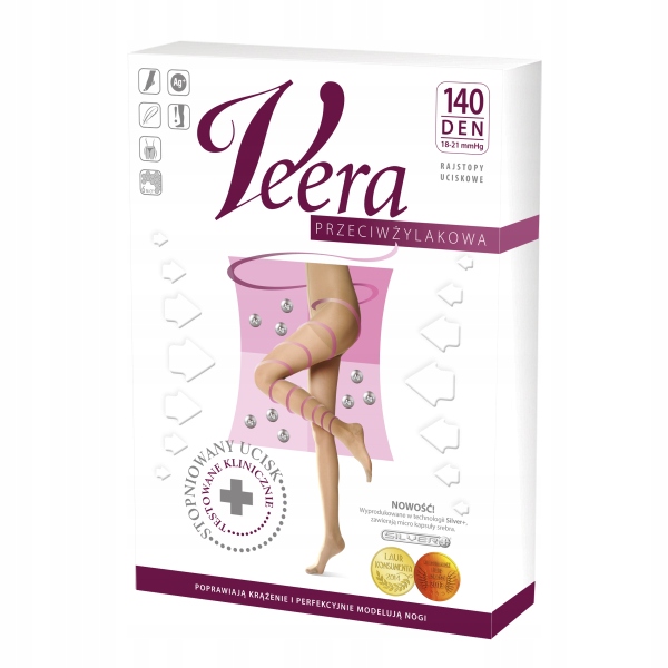Rajstopy uciskowe Veera 140 DEN to idealne rozwiązanie dla osób poszukujących wygody, elegancji i skutecznego wsparcia dla nóg. Te wysokiej jakości podkolanówki w kolorze naturalnym zapewniają stopniowany ucisk, który wspomaga krążenie krwi, redukuje opuchliznę i zmęczenie nóg. Dzięki temu są doskonałym wyborem zarówno na co dzień, jak i podczas długotrwałego stania czy siedzenia. Najwyższej jakości eleganckie podkolanówki Veera ze stopniowanym uciskiem. Poprawiają krążenie i perfekcyjnie modelują nogi. Stosowane w profilaktyce i przy pierwszych problemach z krążeniem. Nadają lekkości nawet najbardziej zmęczonym nogom. Przynoszą szybką i skuteczną ulgę w przypadku pierwszych objawów osłabionego krążenia, takich jak: obrzęk, zmęczenie nóg, uczucie ciężkości nóg, pajączki (pękające naczynka). Są testowane klinicznie, niezwykle trwałe, nie puszczają oczek za sprawą specjalnego splotu plastra miodu, wykonane z przyjemnego w dotyku materiału z dodatkiem Lycry. Posiadają wzmocnione pięty i palce, dzięki czemu są bardzo trwałe i odpowiednio układają się na nodze, ucisk zaś działa we właściwych miejscach. Dbają o komfort i zdrowie Twoich nóg na każdym kroku. Wielokrotnie nagradzane przez Konsumentów.